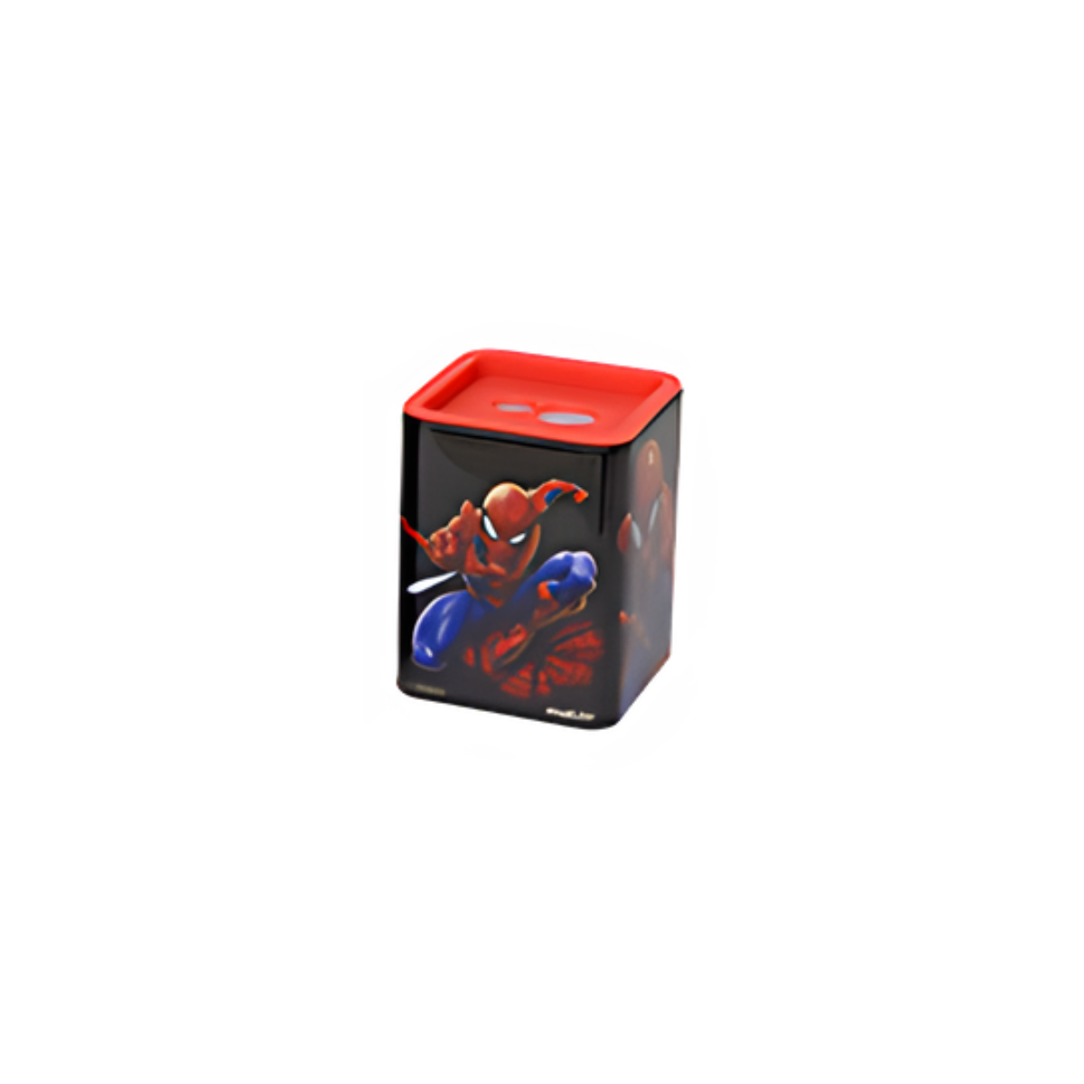 Apontador C/Depósito Quadrado Spider Man da molin,sendo prático e funcional com 2 furos de lápis jumbo e normal ideal pars eus dias escolares com um estilo do amigo da vizinhaça o Homem Aranha!