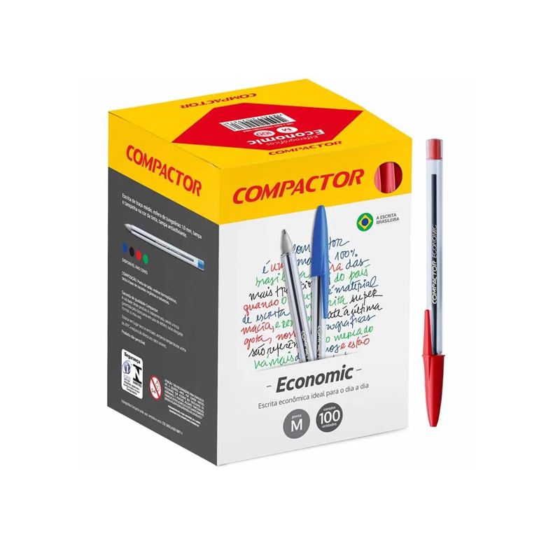 Caneta Esferográfica Economic 1.0mm Vermelha / 100 unidades / Compactor Básica e essencial! Esta caneta da Compactor possui corpo sextavado que garante o conforto na hora da escrita. Tinta de secagem rápida que evita sujeiras e borrões. Além disso, sua tampa é ventilada, evitando que a caneta estoure. Ideal para se ter em sua casa, escritório, escola, entre outros ambientes. Especificações: - Tipo do produto: Caneta - Embalagem: 100 unidades - Tamanho aproximado: 15 cm - Tamanho aproximado da embalagem: 11 x 15 x 11 cm - Ponta: 1,0 mm - Cor: Vermelha - Composição: Resina Termoplástica, Tinta, Solvente, Corante, Metal, Plástico