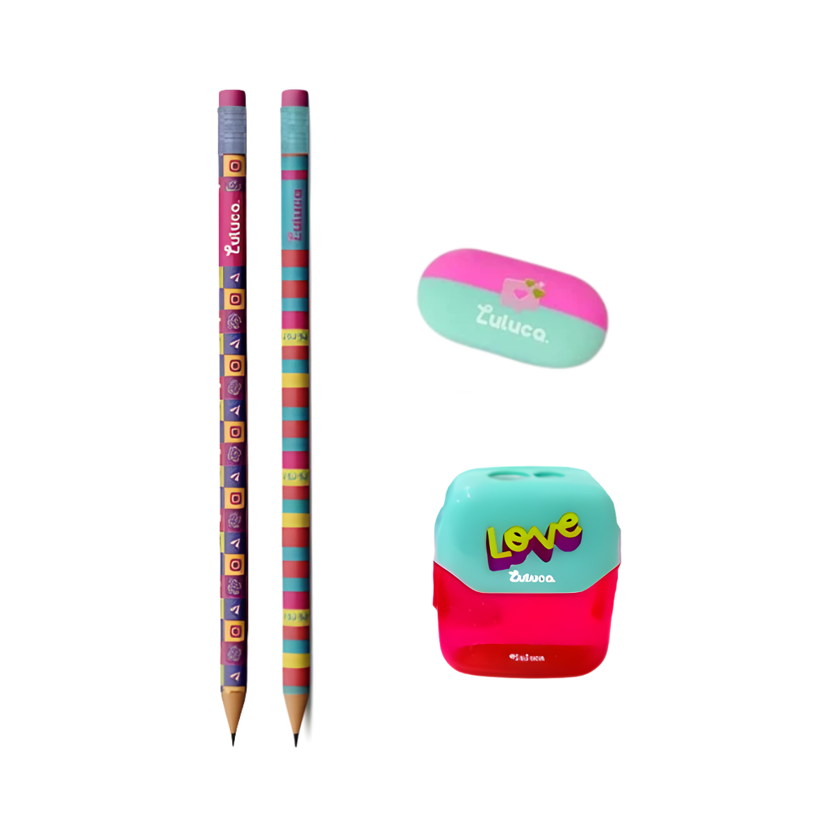 Prático para seus dias escolares em um só Kit lápis Preto HB+Apontador+Borracha Luluca da Skypaper,com um designer de personalidade e eficiênte no ambiente escolar.