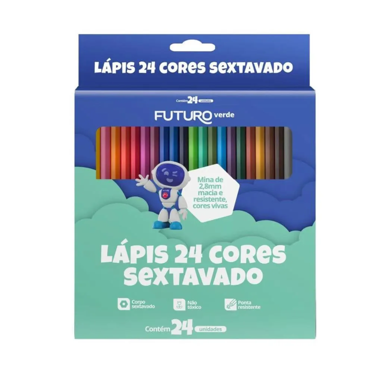 Deixe fluir sua imaginação e criatividade! com o Lápis de cor 24 unidades Sextavado Futuro, com ponta resistente e corpo sextavado evitando que role sobre a mesa, uma escolha ótima para expressar suas habilidades artísticas!