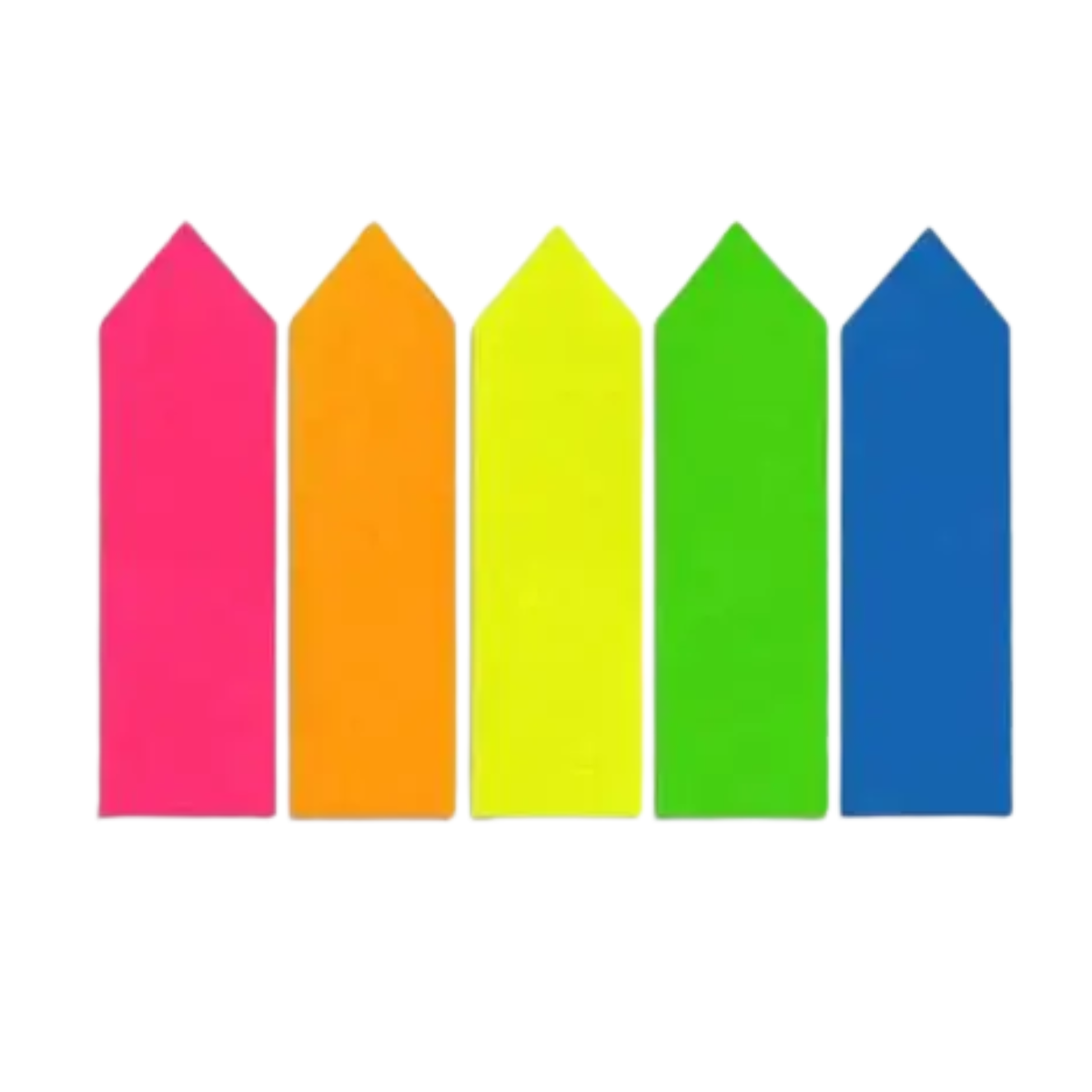 Composto por marcadores em formato de seta com diferentes tons vibrantes e transparência. Resistente à água, reposicionável, não amassa e não danifica as superfícies após ser retirado. Ideais para marcar páginas de livros, destacar datas e compromissos, classificar matérias e informações e organizar documentos. A variedade de cores possibilita diferentes classificações. Marcador De Páginas 12X44mm