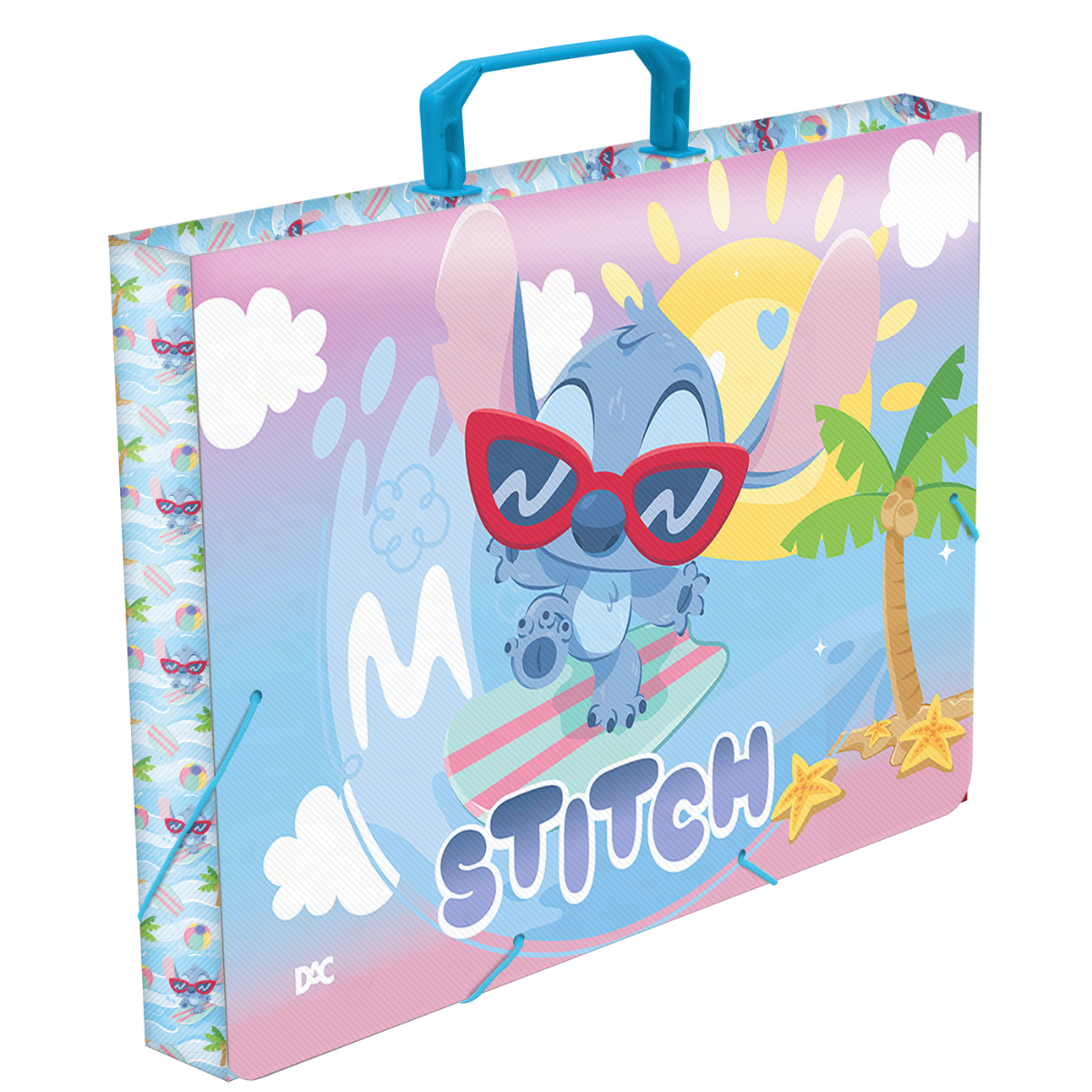 Maleta com tamanho ideal para guardar materiais infantis nos formatos ofício, A4 ou menores. Prática e fácil de transportar para a escola ou qualquer lugar, protegendo os itens contra amassados. Especialmente um estilo super fofo e adorável do monstrinho Stitch!